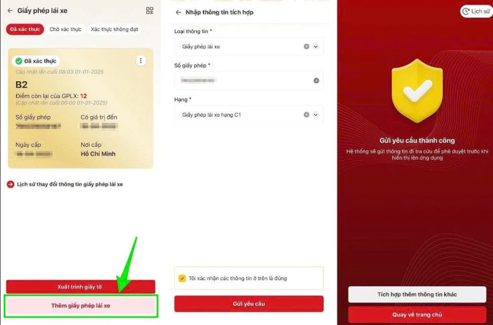 Lưu ý: Nếu bạn có cả Bằng lái xe ô tô và xe máy, bạn cần thực hiện 2 lần tương tự. Sau khi hệ thống xác thực thành công, thông tin Bằng lái xe sẽ được hiển thị riêng biệt trong mục Xuất trình giấy tờ trên VNeID.